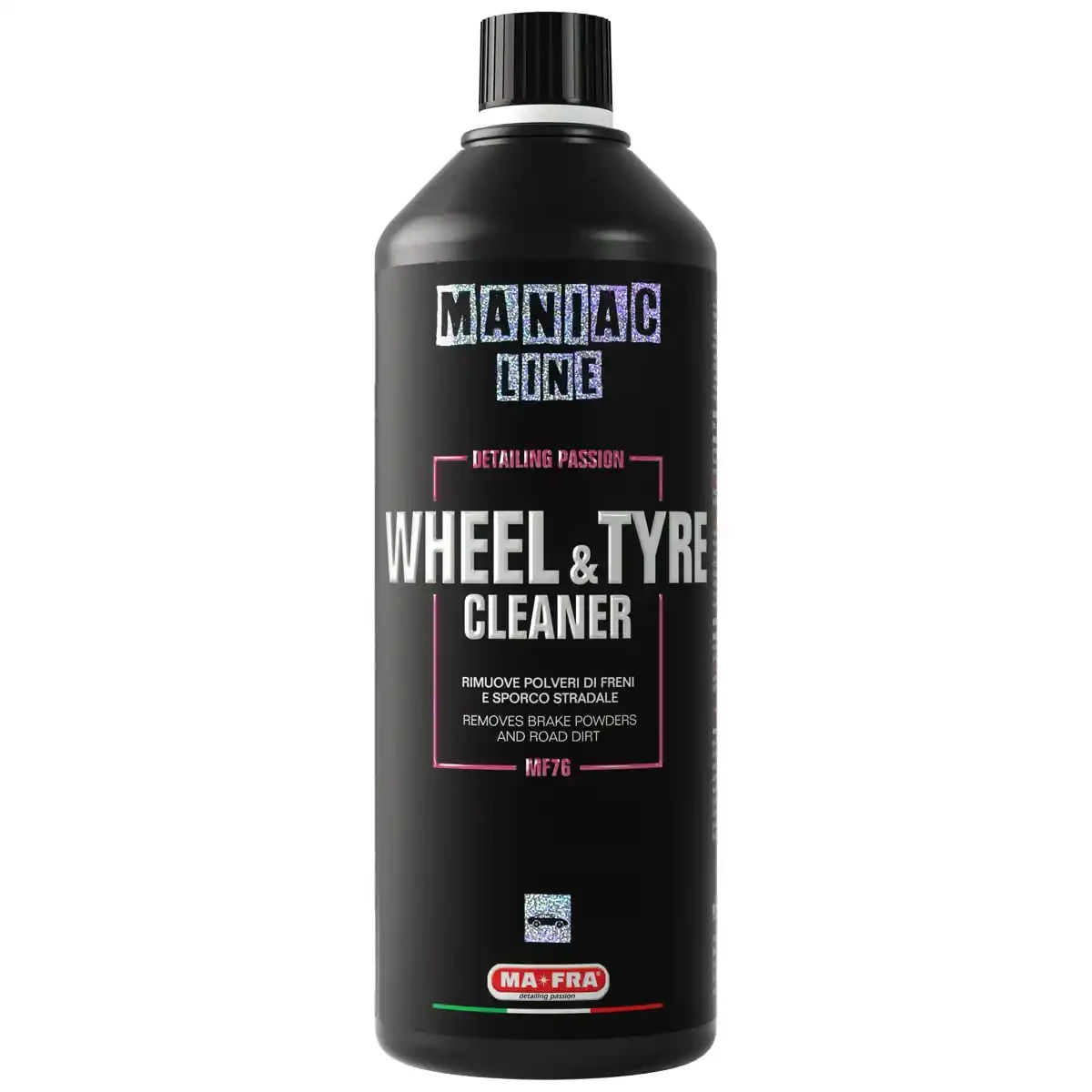 Complete Decontamination for the Dirtiest Part of Your Car Mafra Maniac Line Wheel & Tire Cleaner is a professional-grade, highly effective solution designed to restore the look of your wheels, tires, and wheel wells in one easy step. Wheels face the most extreme conditions—extreme heat, corrosive brake dust, and oily road film—and this specialized formula is engineered to break those bonds without the need for harsh acids.