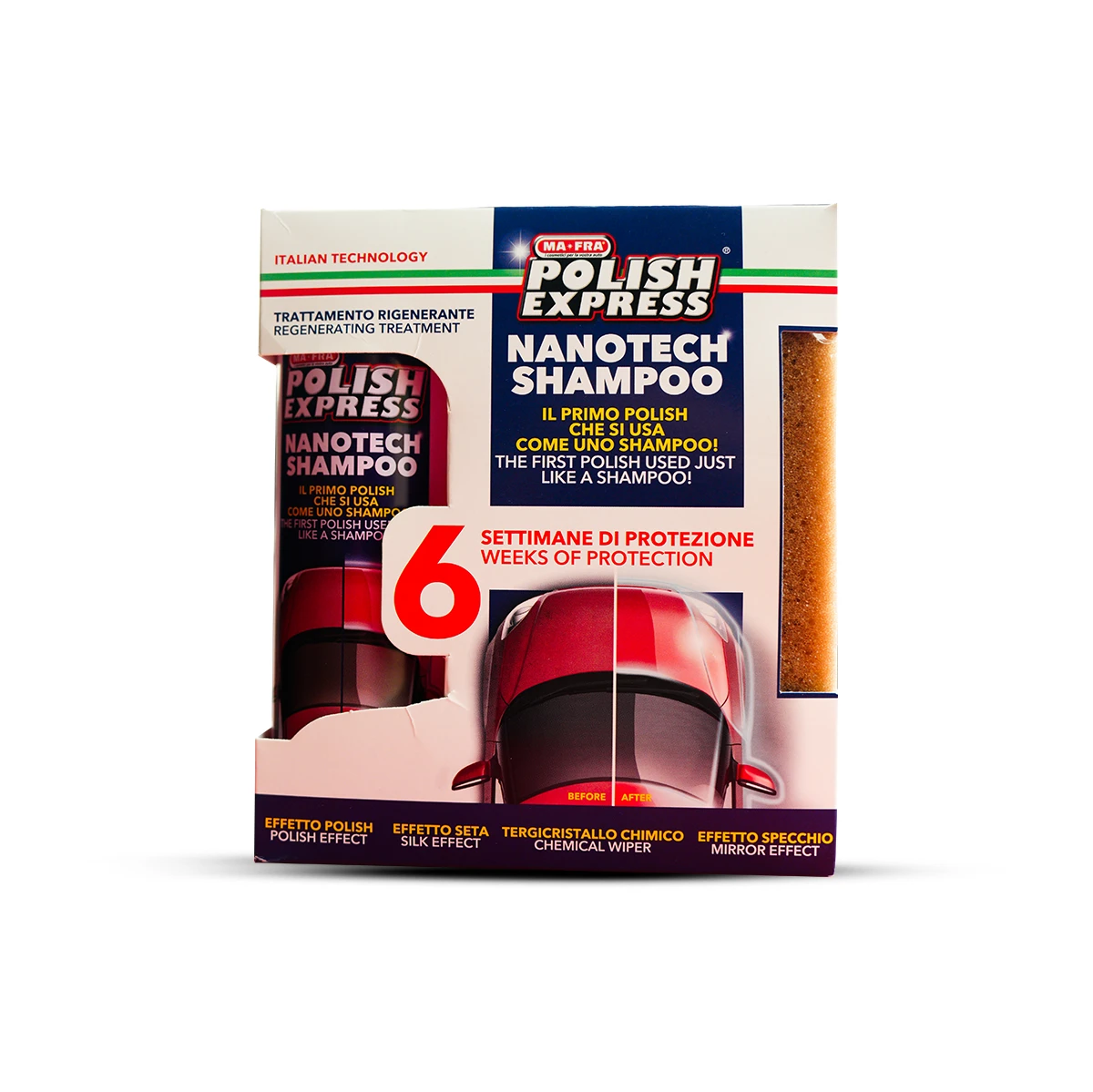 The Revolutionary "Wash-on" Polish for Instant Shine and Protection The Mafra Kit Polish Express is a game-changing 2-in-1 treatment that allows you to polish your car as you wash it. Utilizing advanced Nanotech Polish Technology, this formula doesn't just clean; it seals the paint's pores to create a brilliant, high-gloss finish with a single application. Designed for those who want professional-grade results without the hours of labor, it delivers four distinct benefits: a Mirror Effect for deep reflection, a Silk Effect for a smooth-to-the-touch surface, a Liquid Wiper Effect to repel rain, and a Polish Effect that protects your paint for up to 6 weeks. This all-in-one kit includes a high-quality applicator sponge specifically designed to work the nanotech polymers into the surface for maximum bonding. Product Features: